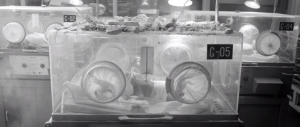 When she first visits the doctor and stops to look at the newborn infants in the maternity ward, an earthquake shakes the building. The scene ends with a lingering shot of a preemie enclosed in an incubator covered with rubble from the ceiling.