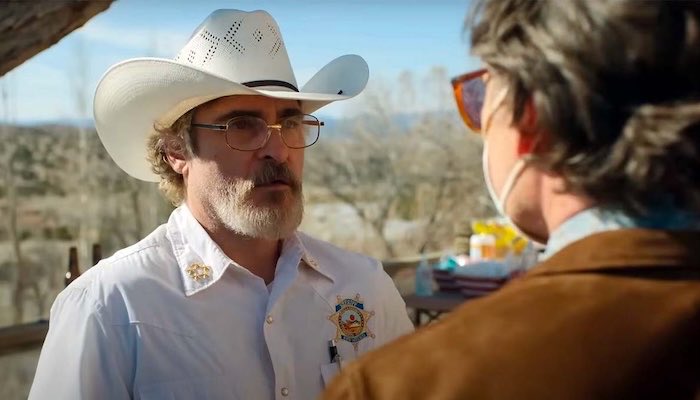 In this scene, small-town sheriff Joe Cross (Joaquin Phoenix) confronts mayor Ted Garcia (Pedro Pascal) at a campaign fundraiser. The two men are at odds politically and personally, and Cross has thrown his hat into the mayor’s race in an escalation of their feud. Now he’s using the power of his badge to disrupt the party due to a noise complaint.
